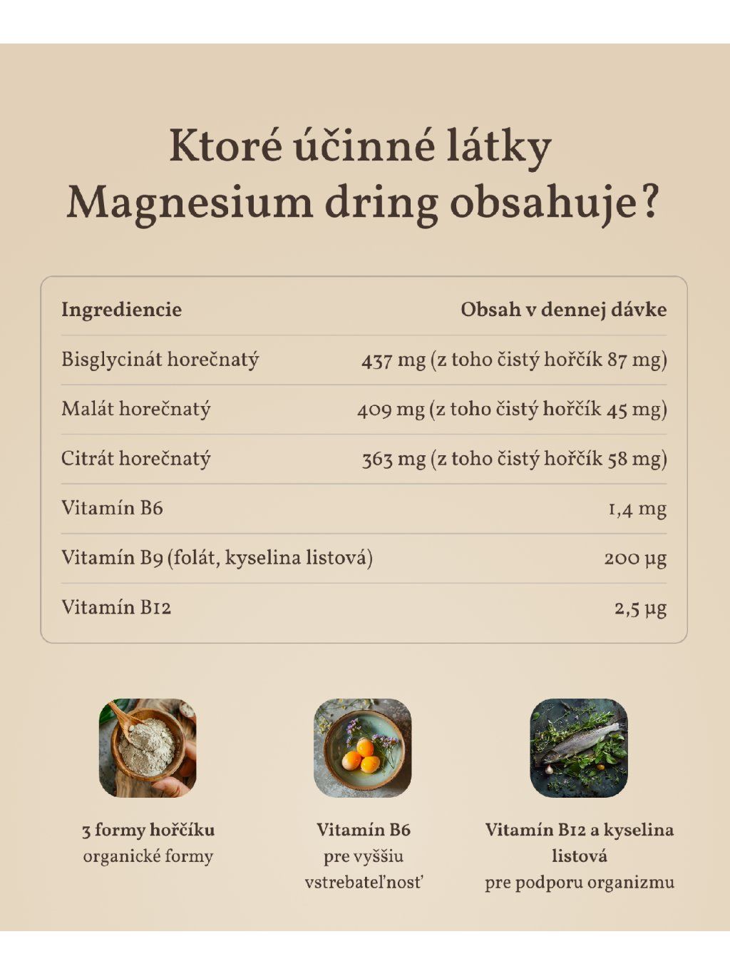 | Bisglycinát horčíka | 437 mg (z toho čistého horčíka 87 mg) |
