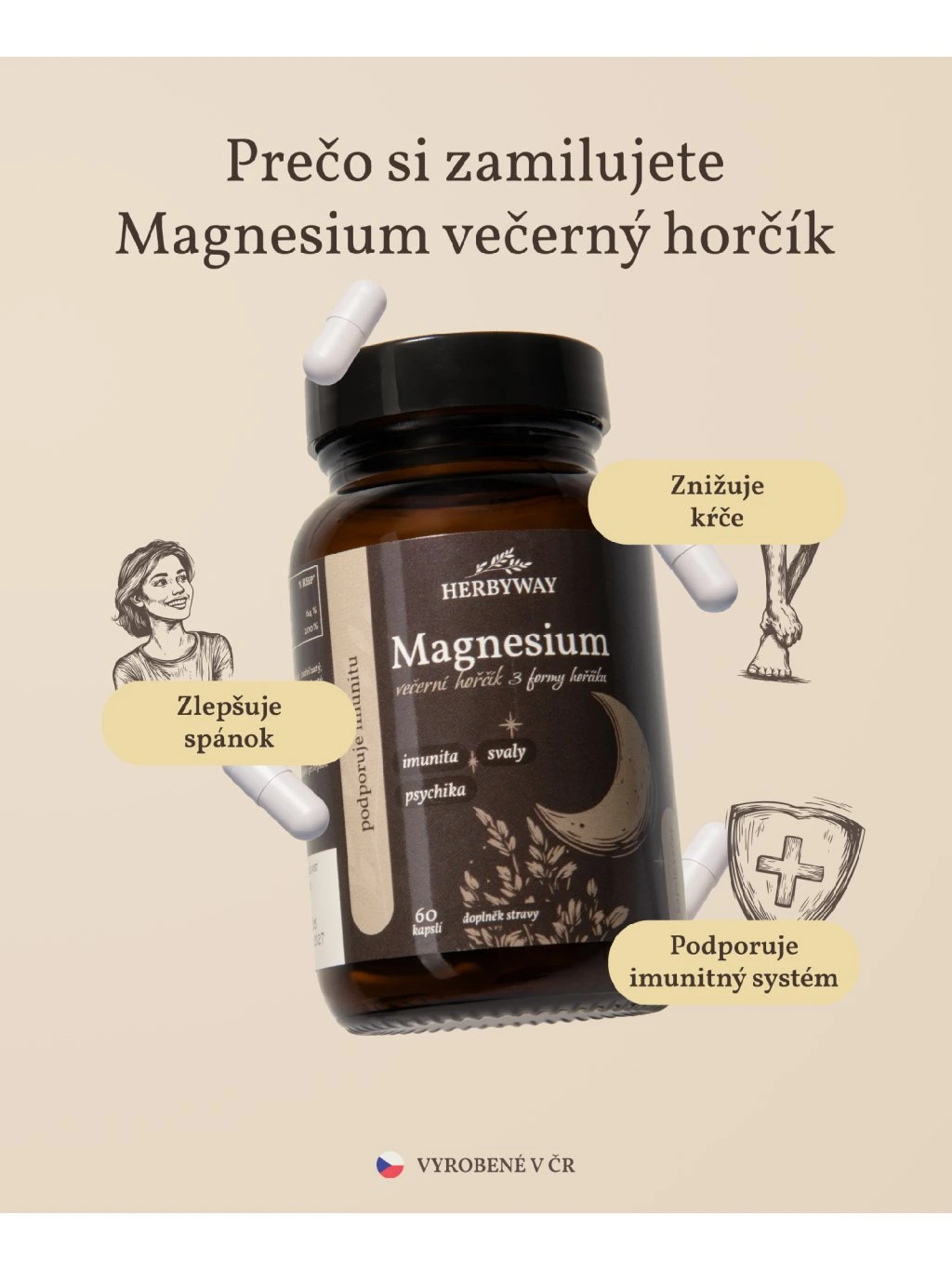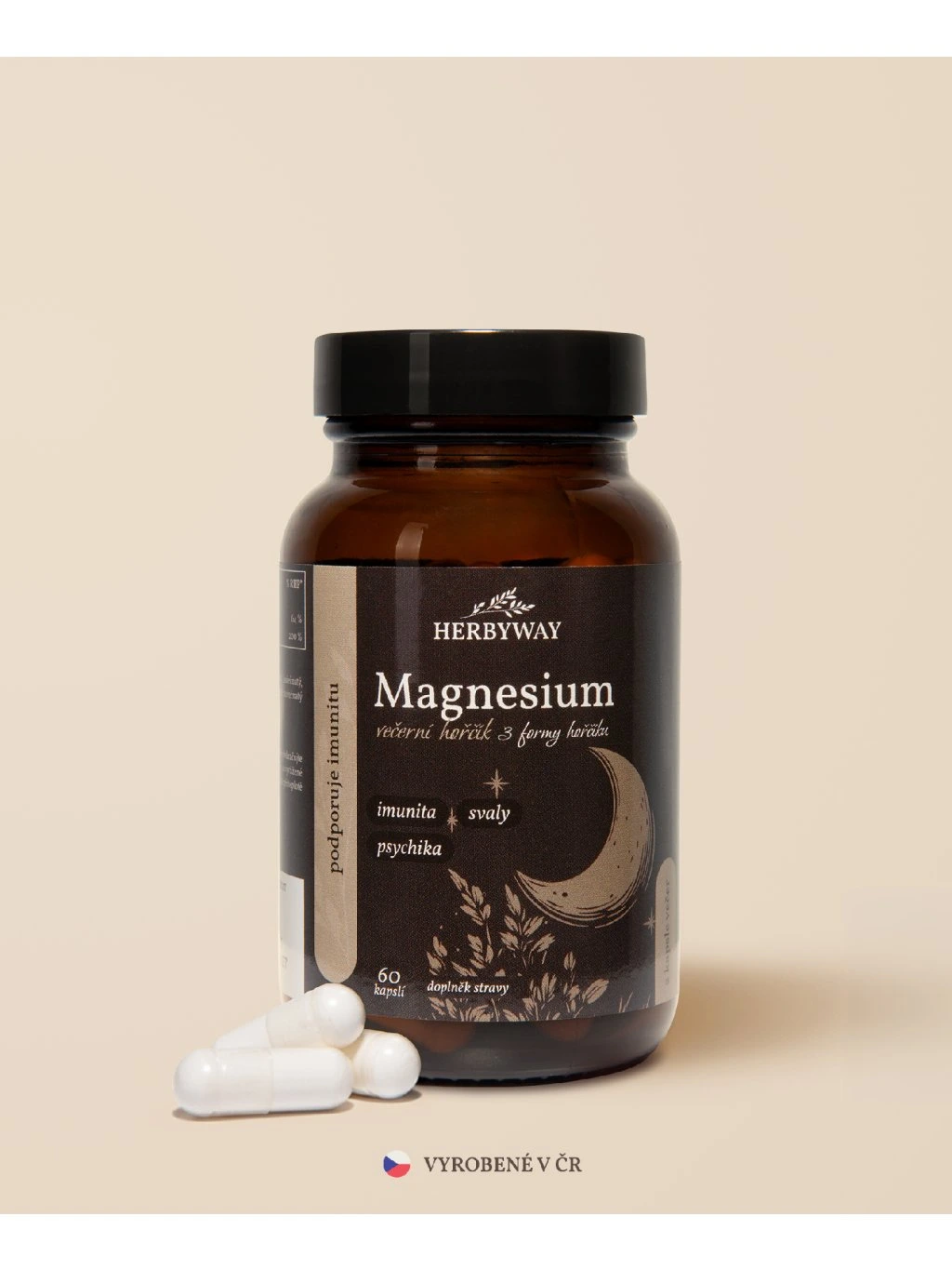 Večerný horčík - kapsule Kapsule s horčíkom bez ďalších plnív. Obsahuje 3 vysoko vstrebateľné formy horčíka na relaxáciu, zníženie stresu, zlepšenie spánku a zníženie kŕčov. Užívajte 2 kapsule večer.